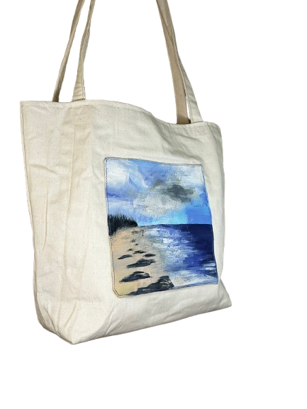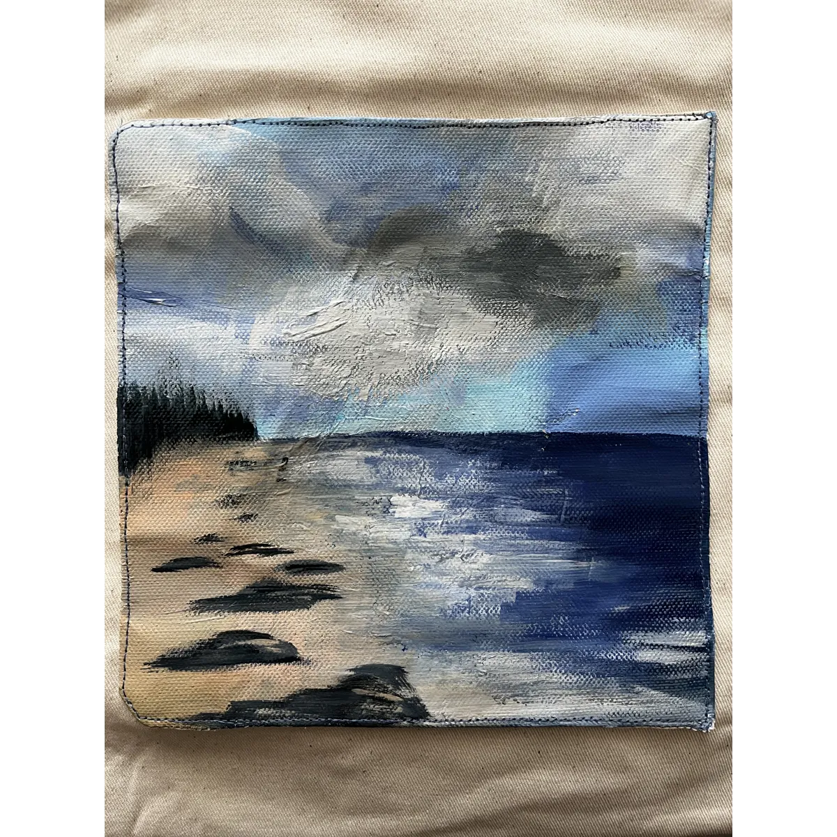Ceker Ljetna oluja, ima vanjski džep kojem je slika naslikana akrilnim bojama, dimenzija 20x20cm, unutra je podstava od popelina sa unutarnjim džepom, ima čvrsto dno koje je potrebno izvaditi kod pranja,pa se  preporuča okrenuti naopako i ručno prati namakanjem.